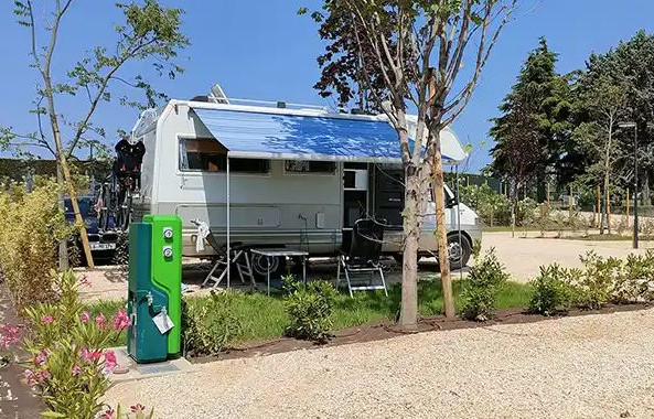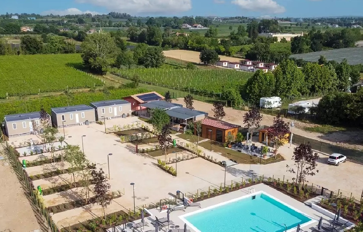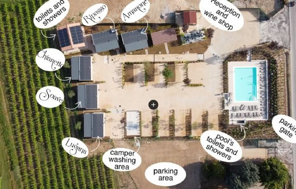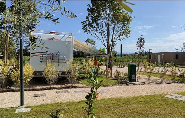Immerso tra i vigneti del Garda, l'agricampeggio dispone di ampio parcheggio per gli ospiti, con accesso autonomo tramite codice, 8 piazzole camper con collegamento idrico ed elettrico da 12A, 5 case mobili di 32 mq dotate di ogni comfort.