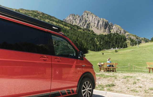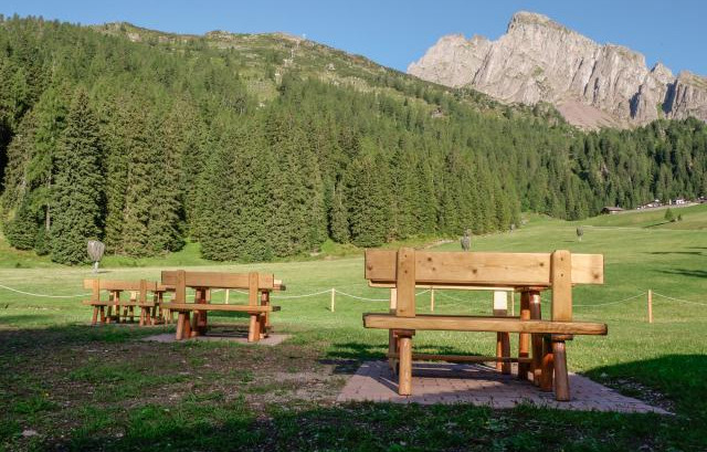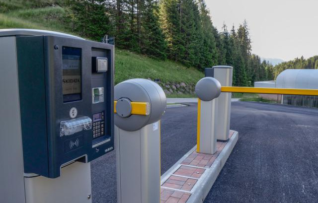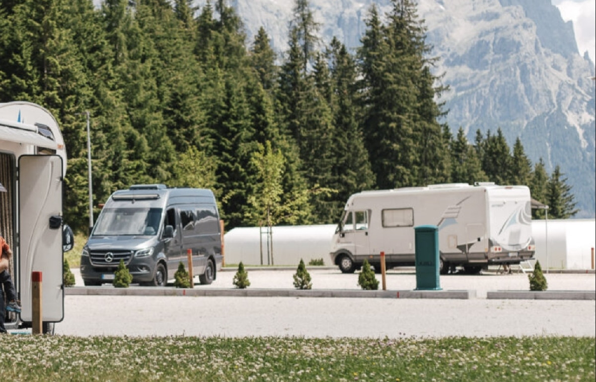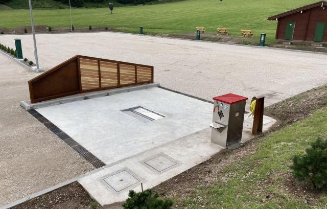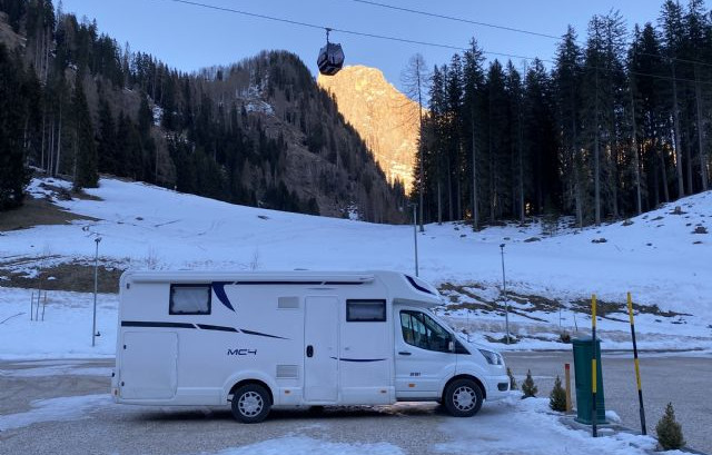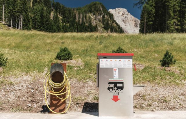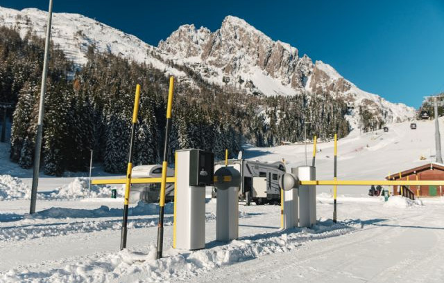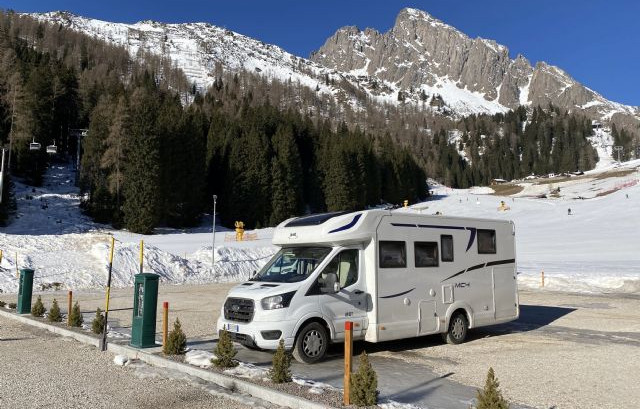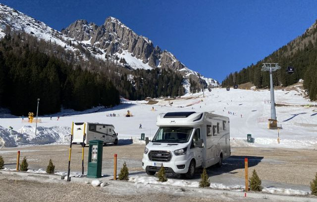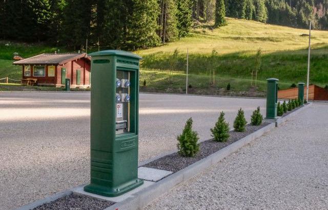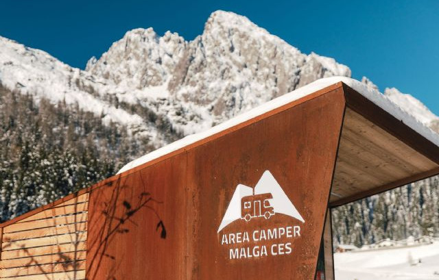 Immersa nel verde, vicina all'impianto della seggiovia di Punta Ces, area sosta completamente automatizzata, a pagamento (carte di credito/debito, bancomat), video sorvegliata, con 24 posti camper.