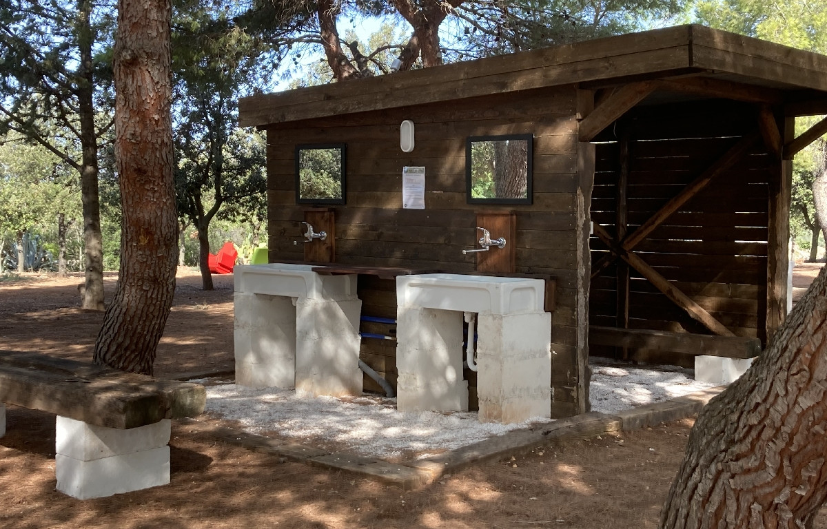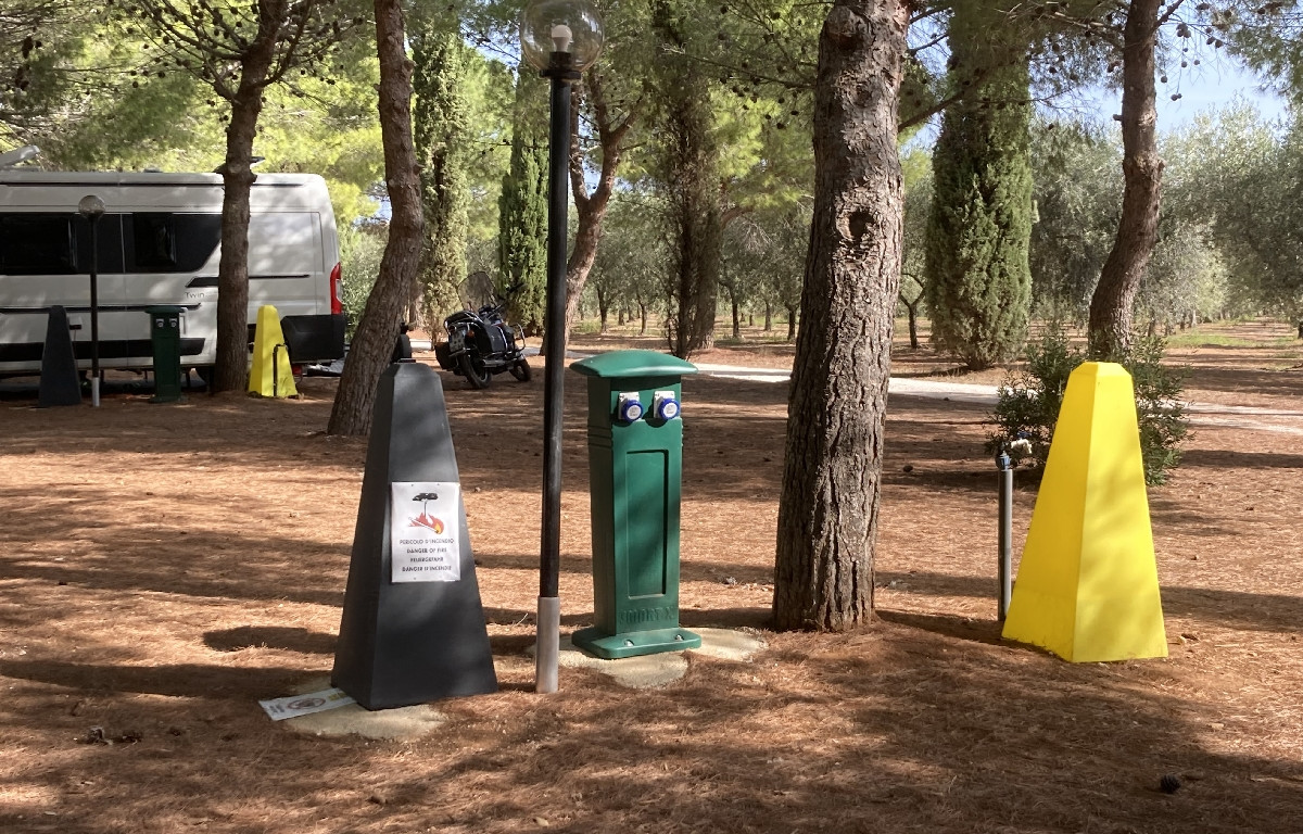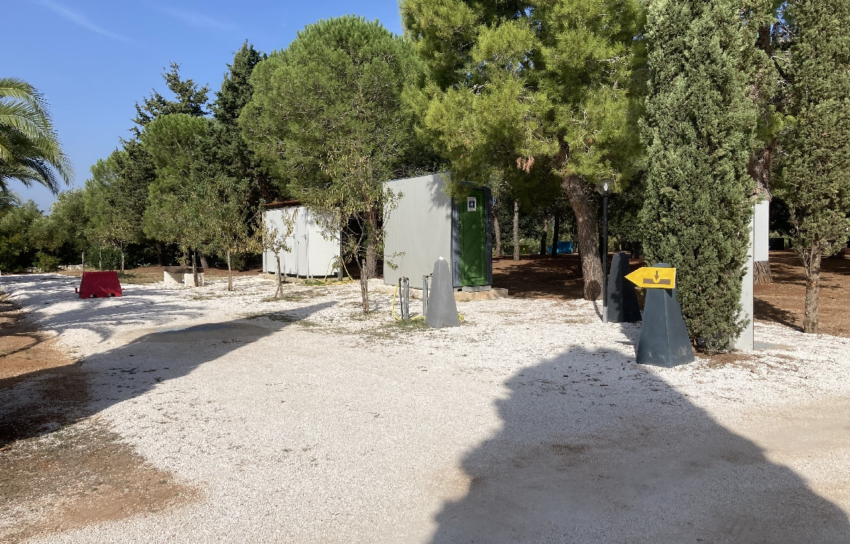 A metà strada tra il Salento e la Valle d'Itria, a 2,5 km dal mare e in posizione strategica per raggiungere le più rinomate località del territorio, la struttura mette a disposizione un'ampia area recintata e video sorvegliata con 15 piazzole per camper e caravan, ombreggiate da pini e dotate di acqua potabile e allaccio elettrico.
