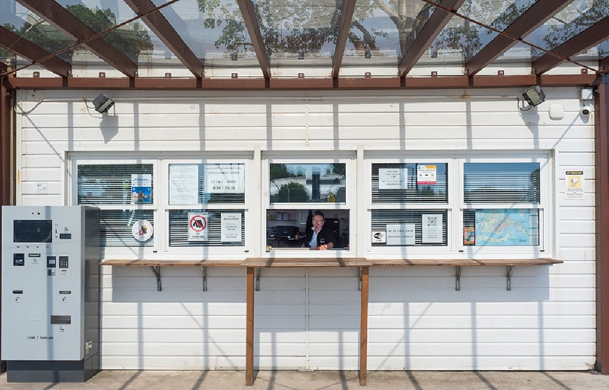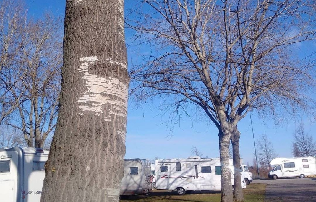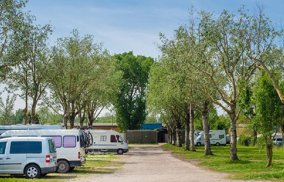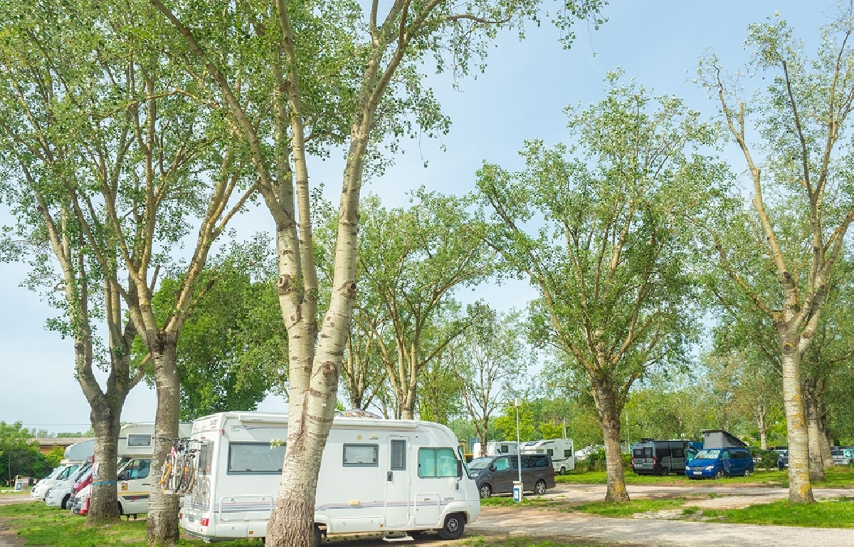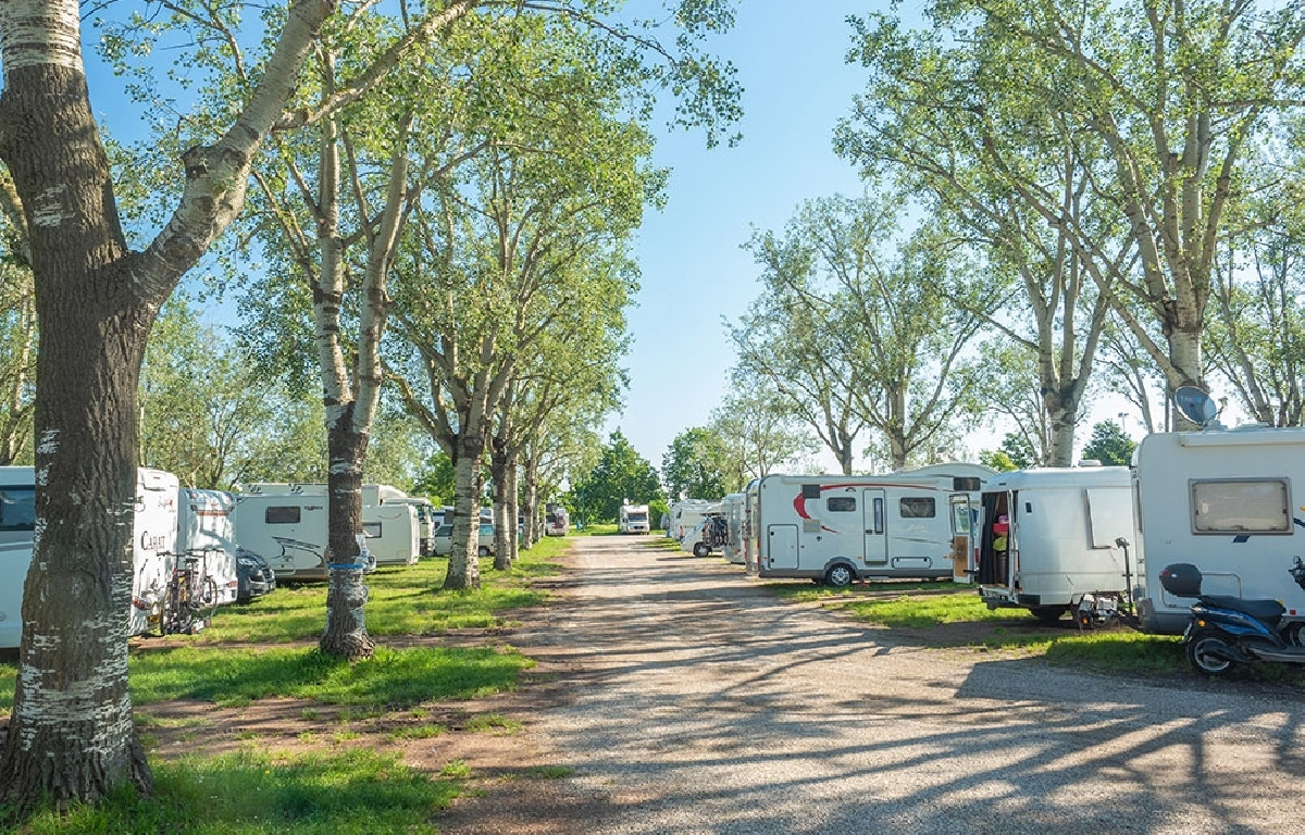 In posizione periferica, area camper con ingresso e uscita regolati da sistemi automatici, 100 piazzole su erba e asfalto, parzialmente ombreggiate.