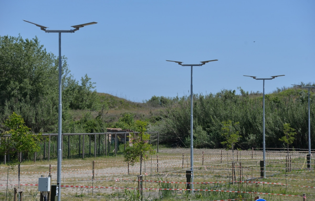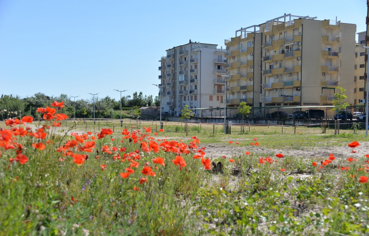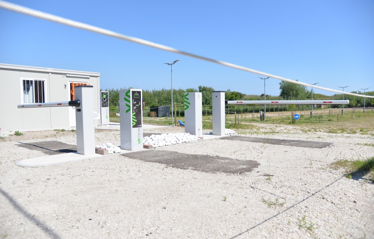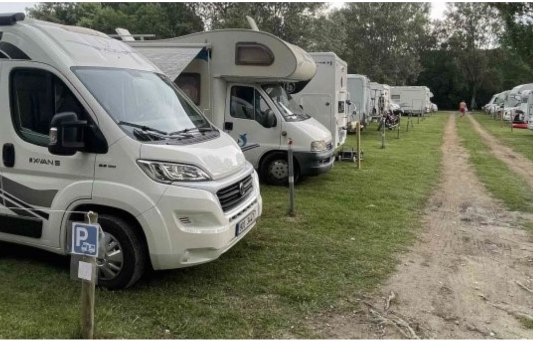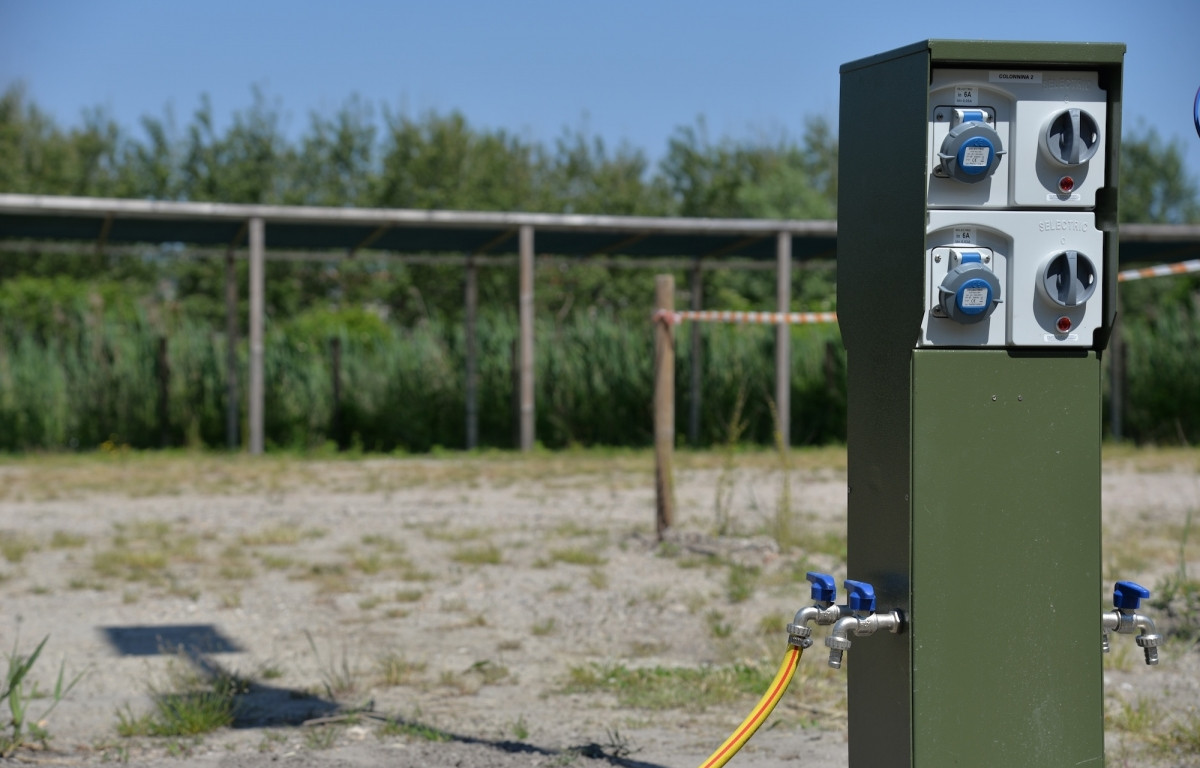 A 350 m dal mare, parcheggio promiscuo a pagamento con cassa automatica dotato di 46 piazzole per camper di 8x6 metri, 16 con allaccio elettrico e idrico e 30 senza servizi.