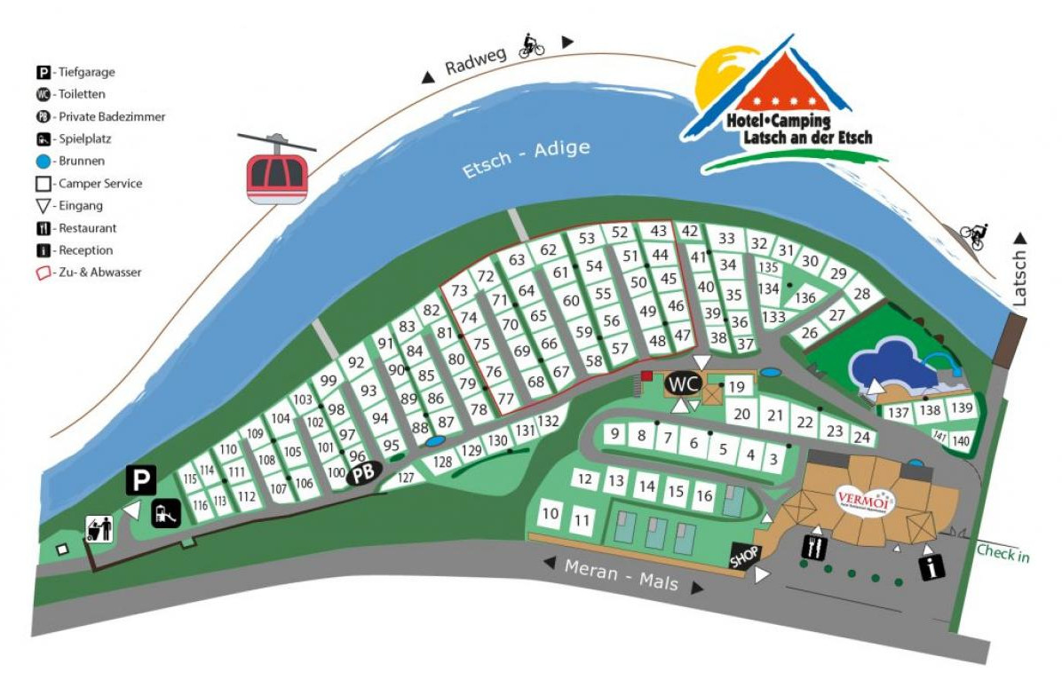 In Val Venosta, a 1 km dal centro capeggio con circa 120 piazzole ognuna dotata di di allacci idrici ed elettrici, mentre le piazzole comfort (posti da 43 a 77) dispongono anche di scarico acque reflue.