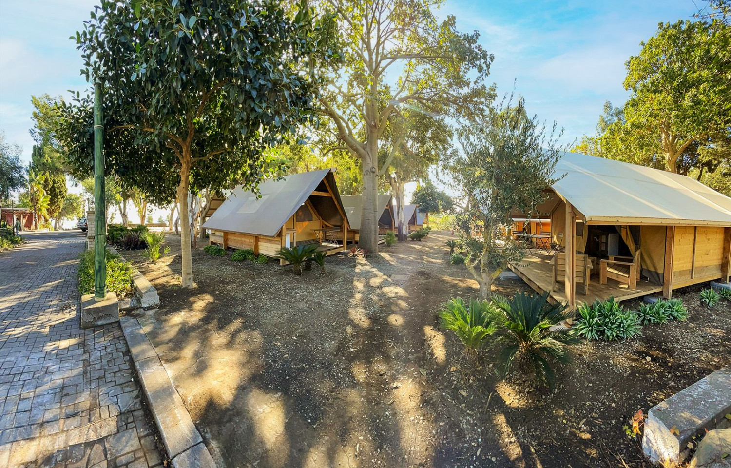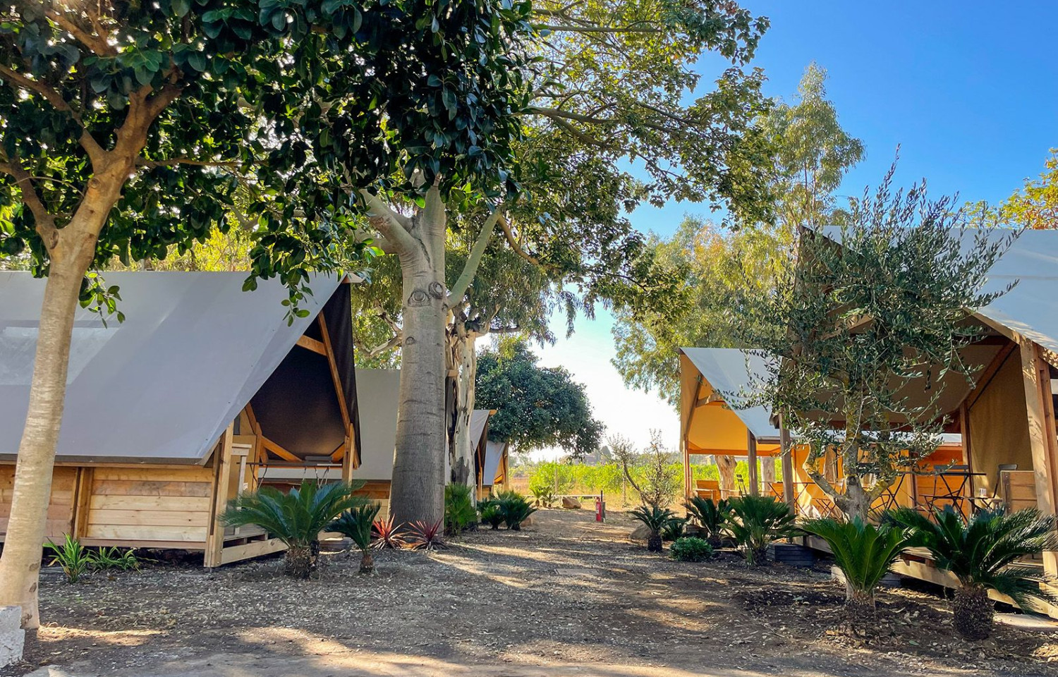 L'atmosfera unica del resort è immersa nel verde degli agrumeti siciliani, con una vista privilegiata sul Mar Ionio. Grazie alla sua posizione strategica, la struttura è facilmente raggiungibile, situata a soli 30 km da Catania e a 40 minuti dall’aeroporto internazionale di Catania-Fontanarossa. Acireale dista 10 km (circa 20 minuti in auto), mentre Giarre si trova a soli 7 km, comodamente collegata attraverso svincoli autostradali e stazioni ferroviarie. Il Pampaleone è quindi l’ideale per chi desidera esplorare la Sicilia orientale, dalla costa alle meraviglie naturalistiche e culturali. In pochi minuti in auto si raggiungono luoghi storici e naturali straordinari, come le Gole dell’Alcantara (35 km), la splendida Taormina (35 km), Aci Castello e Aci Trezza (15 km), oltre ai crateri dell’Etna, il rifugio Sapienza (30 km) e altre attrazioni immerse nel parco naturale del vulcano.Sistemazioni e Unità AbitativePampaleone Glamping & Resort offre un’ampia scelta di sistemazioni ideali per ogni tipo di vacanza, dal comfort del glamping alla praticità delle case mobili, senza dimenticare la libertà offerta dalle piazzole per tende, roulotte e camper.Glamping: Le soluzioni glamping sono perfette per chi desidera unire l’avventura all’eleganza. Le Tende Safari Mandarino, con una superficie di 13 mq, sono pensate per 2 persone e includono una veranda esterna di 5 mq. Queste sistemazioni sono dotate di un angolo cottura e mini-frigo, ideali per chi cerca un rifugio compatto ma funzionale. Le Tende Safari Arancia (28 mq, veranda di 13 mq) sono pensate per gruppi e famiglie, grazie ad ampi spazi interni ed esterni. Completano l’offerta le Tende Safari Pompelmo, la versione di lusso e privacy, spaziose (32 mq più 16 mq di veranda) e perfette per famiglie numerose o coppie in cerca di tranquillità, complete di una cucina ben attrezzata e una zona soggiorno perfetta per godersi la natura.Case Mobili: Se preferite maggiore comfort, le case mobili sono la soluzione perfetta. Le Case Mobili Clementina (22 mq interni e 20 mq di terrazzo esterno), per un massimo di 4 persone, sono ben arredate e climatizzate, offrendo spazio e tranquillità. Le Case Mobili Brunella (30 mq interni) sono particolarmente adatte per famiglie o piccoli gruppi, posizionate in prossimità della piscina e dotate di un angolo barbecue per trascorrere piacevoli serate all’aperto. Le Case Mobili Vittoria e Costanza, ancora in fase di completamento, saranno ideali per famiglie o gruppi più numerosi grazie alla loro capienza (da 2 a 6 persone), con terrazzo e angolo barbecue.Piazzole: Per chi ama la vera esperienza di campeggio, le ampie piazzole del Pampaleone Glamping & Resort, con superfici che variano dai 40 ai 50 mq, sono dotate di attacchi elettrici, rubinetto per l’acqua e servizio Wi-Fi. Ogni piazzola è inserita in una zona ombreggiata all’interno di un bosco di eucalipti, lontano dalla confusione ma comunque vicina ai servizi della struttura, compreso un blocco per il servizio bagno e docce.Servizi ErogatiIl Pampaleone Glamping & Resort è una struttura ricca di servizi pensati per soddisfare ogni esigenza, garantendo una vacanza all’insegna del comfort. La zona piscina, con due piscine, una per adulti e una per bambini, permette di godere di momenti di relax e divertimento con vista sul Mar Ionio. Le piscine sono ecosostenibili, utilizzando acqua di mare per ridurre l’uso di acqua dolce e prodotti chimici. Gli ospiti possono accedere a lettini, sdraio e ombrelloni per un soggiorno sotto il sole siciliano, con un chiosco che offre bevande rinfrescanti, gelati e i tipici seltz con limone e sale.All’interno del resort è presente un bar e una pizzeria, dove gustare piatti tipici e specialità locali, perfetto per chi non vuole allontanarsi dalla struttura. Parcheggio riservato, Wi-Fi gratuito, servizio lavanderia self-service e un'area attrezzata per lo scarico delle acque reflue sono solo alcuni dei servizi che il Pampaleone offre per un soggiorno senza pensieri. Gli ospiti possono inoltre usufruire del parcheggio interno e lasciare la loro auto per esplorare in tranquillità i dintorni, approfittando della vicinanza ai principali trasporti pubblici e alla rete autostradale.Attività e IntrattenimentoDurante il soggiorno, gli ospiti del Pampaleone Glamping & Resort non mancheranno di divertirsi e rilassarsi, grazie alle molteplici attività sia all’interno che nei dintorni della struttura. Oltre al relax in piscina e ai servizi del resort, i più sportivi possono avventurarsi nel contesto naturale circostante, perfetto per escursioni a piedi o in bicicletta. Il vicino Monte Etna offre numerosi percorsi trekking e opportunità per esplorare il parco naturale che lo circonda, inclusa la visita ai crateri e alle caverne di lava.Per chi ama la storia e la cultura, a meno di un’ora in auto, si trova Taormina, famosa per il suo teatro antico e la vista mozzafiato sul mare. Non troppo distante, la città di Catania offre monumenti barocchi, vivaci mercati e un'architettura che racconta la storia della Sicilia. Chi preferisce una giornata di mare, può raggiungere le spiagge della costa, come quella di Fondachello, facilmente accessibile in pochi minuti in auto.Il resort organizza anche escursioni e tour per scoprire le meraviglie dei dintorni, tra cui le Gole dell'Alcantara, che offrono spettacolari scenari naturali, oppure una visita ai paesi circostanti, come Zafferana Etnea, famosa per i suoi prodotti tipici e il paesaggio incontaminato.