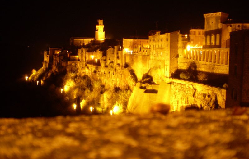 Pitigliano sorge su una rocca di tufo appeso tra cielo e terra e’ di sera con i fari che dal basso puntano verso l’alto e’ di un impatto visivo molto suggestivo.