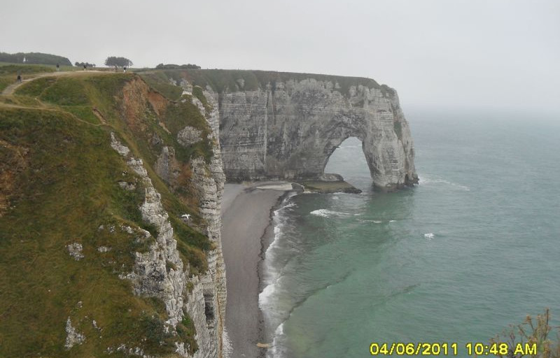 siamo svegliati da un poco simpatico rumore di barchette a motore che iniziano le gite turistiche, la giornata è calda e assolata da permetterci di nuovo di muoverci in bici, visitiamo la cattedrale di notre dame, il parlamento, poi passeggiamo nei bellissimi vicoli con le case a graticcio passando dalla torre dell'orologio, il tempo stringe cosi' ripartiamo ma prima di raggiungere ETRETAT ci fermiamo a CLERES un pittoresco paesino a 28 km da rouen "famoso" per il suo parco botanico e zoologico, che oltre ad essere immerso in un bosco meraviglioso ricco di tante specie di alberi e fiori, ha la particolarita' che quasi tutti gli animali (antilopi, pellicani, pavoni, fenicotteri, canguri.. si' avete letto bene.. canguri) sono liberi!! poi ci sono delle scimmiette in gabbia e un bel castello .. l'entrata è di 6 euro e ne vale la pena!! in piu' in questo paese c'è una bell'area di sosta camper con cs e colonnine elettricita' a gettone. La nostra vera prima tappa in Normandia comincia da ETRETAT dove arriviamo in serata e dove pero' non troviamo un posto ne' nell'area ne' nel campeggio all'entrata del paese, cosi' ci "accomodiamo" in qualche modo sul prato come tanti altri camper, per niente scoraggiati con la bici raggiungiamo immediatamente le falesie e che fortuna: riusciamo ad ammirare uno dei piu' bei tramonti che abbia mai visto! l'unico cosa negativa è il clima, da qui in avanti infatti avremo a che fare con temperature ben distanti dal nostro giugno quasi estivo, tanto vento e qualche temporale, ma eravamo preparati e questo fattore non ha inciso affatto alla buona riuscita del viaggio.