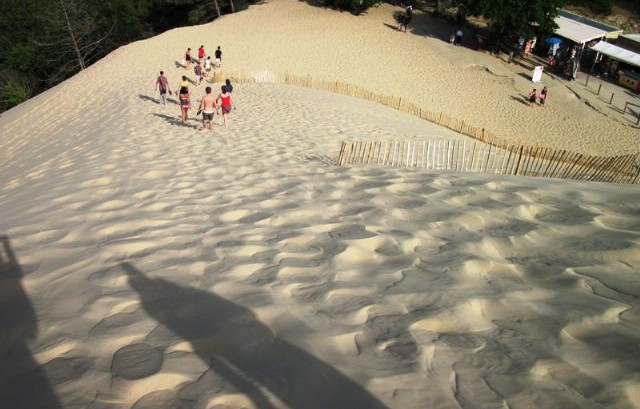 Piove ancora quando ci mettiamo in viaggio: oggi faremo una bella tirata verso sud e contiamo di raggiungere l’Aquitania nel pomeriggio. Per pranzo ci fermiamo in un SuperU, a Marans, dove approfittiamo per fare cs con il gettone da 2 euro acquistato alla cassa del supermercato. Conosciamo abbastanza bene la Francia, ma ogni volta ci stupiamo di quante opportunità offrano per il turismo itinerante ... Proseguiamo ancora, questa volta accompagnati dal sole e verso le 18.00 siamo finalmente a Pylat dove visiteremo la famosa duna: è la più alta d’Europa ha un’altezza di circa 120 metri, lunga circa 3 km (da nord a sud) e larga circa 500 mt. Una creazione mastodontica, imponente, formatasi in modo del tutto naturale in qualche centinaio di anni. Per salirvi in cima c’è una lunga scalinata oppure, come abbiamo fatto noi e molti altri, la si può scalare guadagnando la vetta con un po’ di fatica, ma con grande soddisfazione. Giunti in cima il panorama è a dir poco spettacolare: si vede tutta la duna nella sua maestosità, quindi la vastità dell’oceano pacifico! Il vento sferza inarrestabile e la sabbia punge le gambe, sebbene scalzi ed in pantaloncini si viva un’esperienza davvero unica. Il sole è ancora alto sull’orizzonte e noi, come le centinaia di persone presenti, cerchiamo di trarne tutta l’energia quasi ci trovassimo in un luogo magico … Anche per la discesa si può utilizzare la scala, ma noi la evitiamo più che volentieri preferendo una bella corsa lungo il ripido pendio affondando nella sabbia e divertendoci come matti! Torniamo al camper ed all’uscita non ridiamo più tanto poiché paghiamo 8.00 euro per la sosta (di neanche un’ora), ma del resto non c’erano altre possibilità poiché la strada che conduce al sito è tutta divieto di sosta fino all’ingresso del grande parcheggio: pazienza, è stata comunque una bella esperienza che consigliamo assolutamente e questa volta il tempo è stato dalla nostra visto che l’indomani ha piovuto nuovamente!!! Pochi minuti e raggiungiamo Biscarrosse dove troviamo l’area sosta (N44°27.664 E01°14.700) immersa in un’enorme pineta. La sosta è consentita ovunque e non ci sono spazi delimitati. Non riusciamo a capire come e dove pagare quindi decidiamo di sistemarci rimandando a domani il problema. Per cena ci concediamo bistecche alla griglia ed a seguire una breve passeggiata alla ricerca del mare attraverso la pineta: raggiungiamo l’oceano appena in tempo per assistere ad un tramonto infuocato e scattare un paio di fotografie. Molto suggestivo, come suggestivo è del resto il luogo in cui ci troviamo: silenzio più totale e buio assoluto, puntinato qua e là dalle luci di altri camper in sosta … Verso le 23.00 due incaricati per la riscossione (in divisa) bussano alla porta e paghiamo i 12.00 euro previsti. Lo facciamo in contanti, ma loro hanno anche il pos e naturalmente ti rilasciano tanto di ricevuta: davvero efficienti e soprattutto molto cortesi.