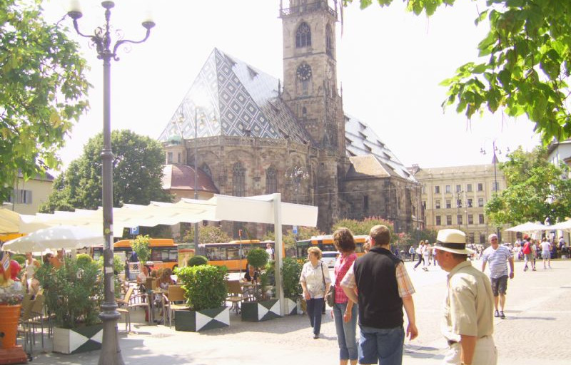 Al mattino martedì 24, il cielo si presenta alquanto variabile e allora si decide di dedicare la giornata alla visita di Bolzano. Parcheggiamo il camper in un'area di sosta vicino alla fiera di Bolzano e con la stazione ferroviaria comodissima per raggiungere il centro. Un treno ogni mezz'ora della linea Merano - Bolzano. Il tempo volge poi al bello però non siamo assolutamente pentiti della visita, Bolzano merita veramente di essere visitata e non solo nel periodo dei famosi mercatini di Natale.