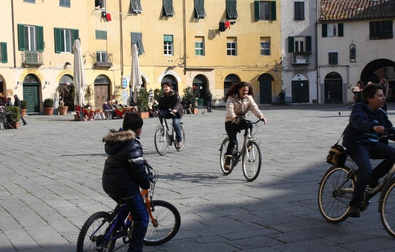 Dopo aver raggiunto il piazzale Verdi oltre le mura di cinta della città noleggiamo le biciclette ed attraversiamo “tutti insieme appassionatamente”(o quasi) il centro storico di Lucca.