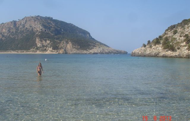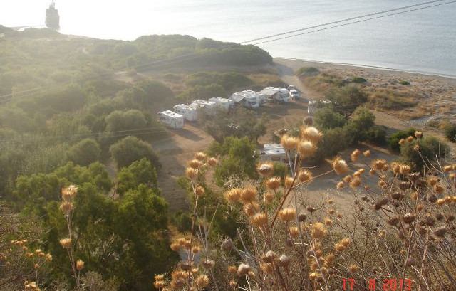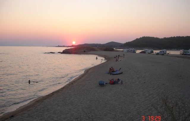 Trascorriamo l'intera giornata in questo lido calmo e tranquillo, tra bagni e riposini. L'acqua é di una trasparenza notevole. La caratteristica del mar Egeo, é proprio quella di essere caldo e calmo, infatti pian piano arrivano molte famiglie con bambini. Notiamo che i primi bagnanti arrivano non prima delle 10,00 e continuano ad arrivare ininterrottamente con ombrelloni e sdraio anche oltre le 18,00, rimanendo in acqua anche fino alle 21,30. Qui ci sono soprattutto serbi, ungheresi e bulgari. Rimaniamo a dormire qui anche stanotte perché si sta veramente bene, ci sposteremo domattina. Prima di ripartire approfittiamo dei bagni pubblici per vuotare la cassetta e con il secchio un pó di grigie, situati su una struttura di mini appartamenti a ridosso della spiaggia completamente abbandonati, un classico ecomostro di cui non ce ne sarebbe stato veramente bisogno e che deturpa questa incantevole spiaggia di mare cristallino incastonata tra due promontori di scoglio e ricca di vegetazione.