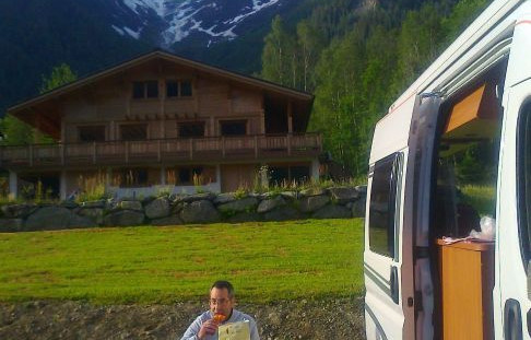 Risveglio con vista sul Monte Bianco, tra chalet di montagna boschi e prati, colonna sonora gli uccellini che cinguettano, il nitrire dei cavalli, il rumore del ruscello dietro il bosco. I 15 euro meglio spesi della nostra vita... (tale e’ il costo a notte in quell’area di sosta).