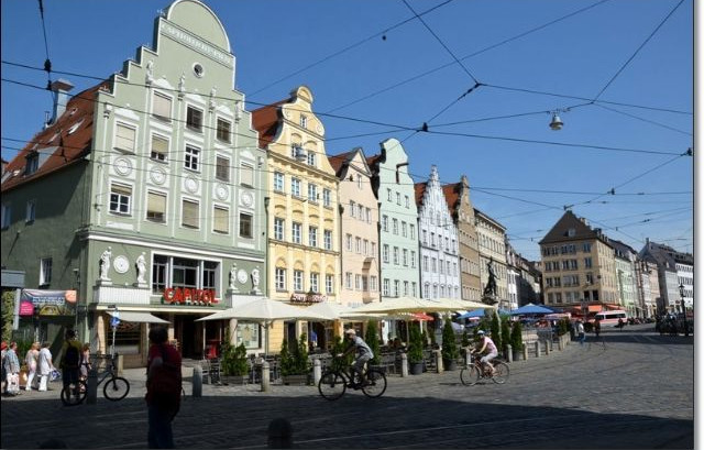 Lasciamo con tutta calma il camping e ci spostiamo ad Augsburg, accompagnati anche oggi da un caldo torrido che supera i trenta gradi. Prima di giungere in città ci fermiamo in un Aldi per fare spesa e poi, verso le 13,30 troviamo (dopo aver chiesto indicazioni ad un ragazzo del luogo) un P+R, per fortuna con alberi secolari che creano ampie zone d'ombra. Il P+R si chiama Sud an der Sportanlage, in IISungstrasse 11 (N48°20.411 E010°54.573). Dopo pranzo ci spostiamo (col tram numero 2) in centro e passeggiamo lungo Maximilianstrasse, ammirando i bei palazzi edificati tra il '500 ed il '700 e perfettamente conservati. Fondata nel 15 a.c. dall'imperatore Augusto, è la terza città più grande della Baviera (dopo Monaco e Norimberga) ed è inserita nel percorso della famosa strada romantica: visitiamo Rathausplatz, piazza del municipio dove si trova anche la chiesa di St. Peter con la sua torre alta 70 mt, quindi la fontana Augustusbrunnen realizzata nel 1500 circa proprio in onore del fondatore della città. Una bibita fresca all'ombra di un gazebo e prima di cena rientriamo al camper, quindi al vicinissimo Camping Bella Augusta: anche in questo caso si tratta di una struttura "essenziale", ma troviamo comunque il necessario per rimetterci in sesto prima di riprendere il viaggio.