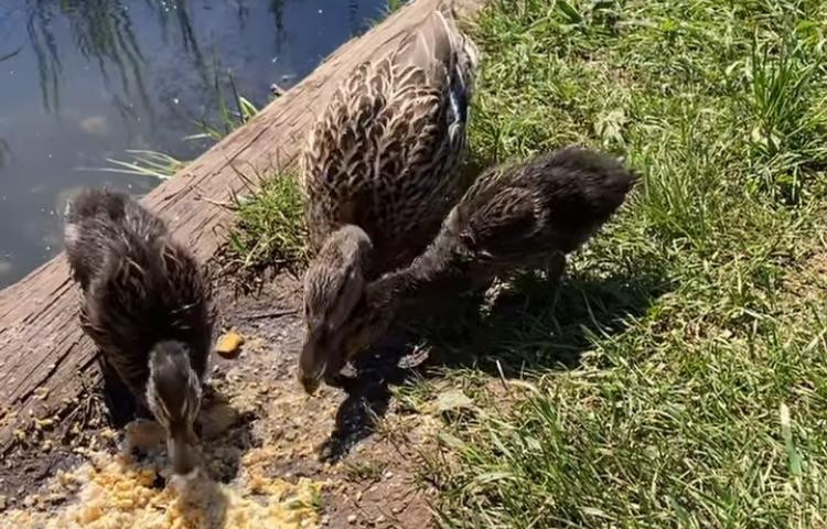 Nel lago ci sono papere e pesci rossi grandicelli.