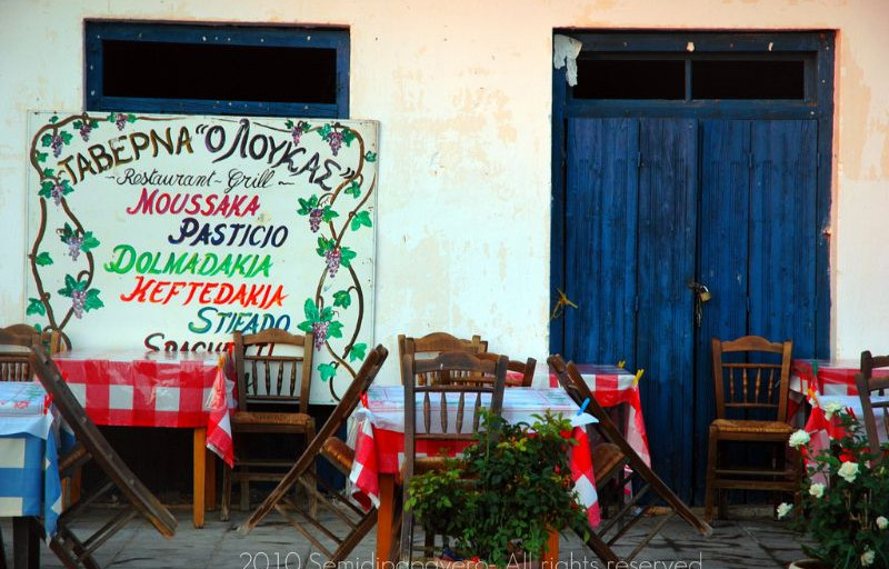 Ceniamo con insalata greca, Souvlaki( spiedini di carne di maiale), Tigania (bocconcini di maiale fritti, morbidissimi) patatine fritte e salsa Tzaziki. In cinque spendiamo meno di 30 euro.