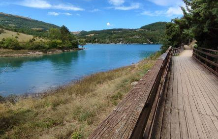 La mattina abbiamo raggiunto il lago di Fiastra dove è possibile parcheggiare gratuitamente in un'area sosta camper (solo 5 posti complessivamente). Dalla spiaggia inizia il sentiero del lungolago adatto a tutti. Nel percorso si trovano noleggiatori di biciclette, spiagge, lettini e ombrelloni, un'area dedicata ai cani dove possono fare il bagno, e un'area picnic con possibilità di parcheggiare nei pressi.