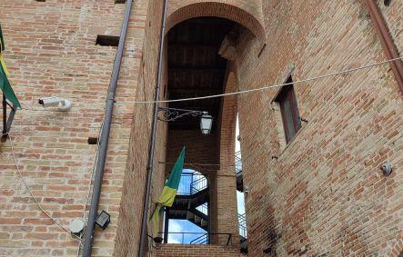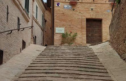 Il paese ci accoglie con un grande arco. L'area sosta con servizi, gratuita, realizzata presso la vecchia stazione il cui treno collegava la montagna al mare di Porto S. Elpidio, è poco distante dal paese ed in prossimità di un supermercato.