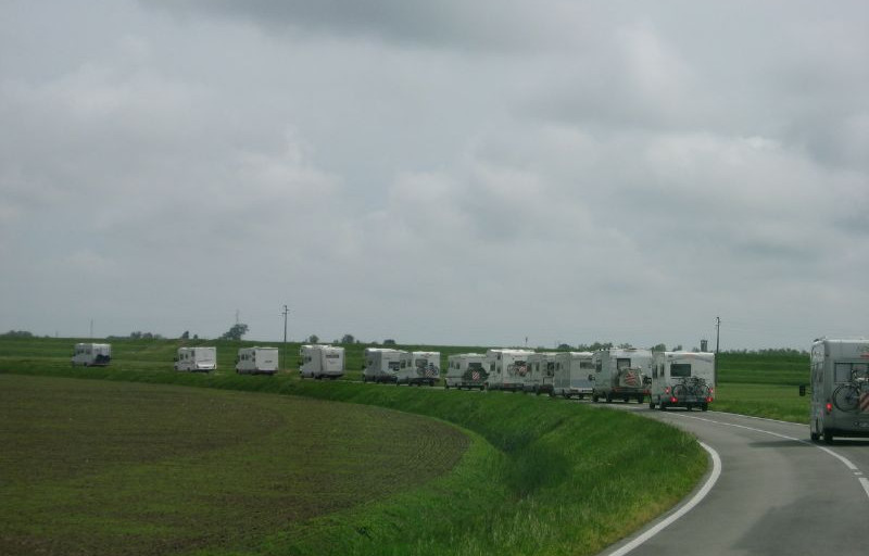 Il gruppo di 14 camper del Camper Club Mantova percorre il confine tra acqua e terra dell'isola della Donzella che circonda la bella Sacca degli Scardovari.