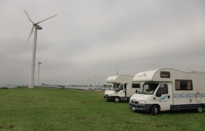 il tutto esaurito dei posti camper. Mentre decidiamo sul da farsi un signore olandese si affaccia dalla sua "casa vetrina" e ci chiama indicandoci un'area sterrata adiacente al camper stop dove sosteremo indisturbati per la notte.