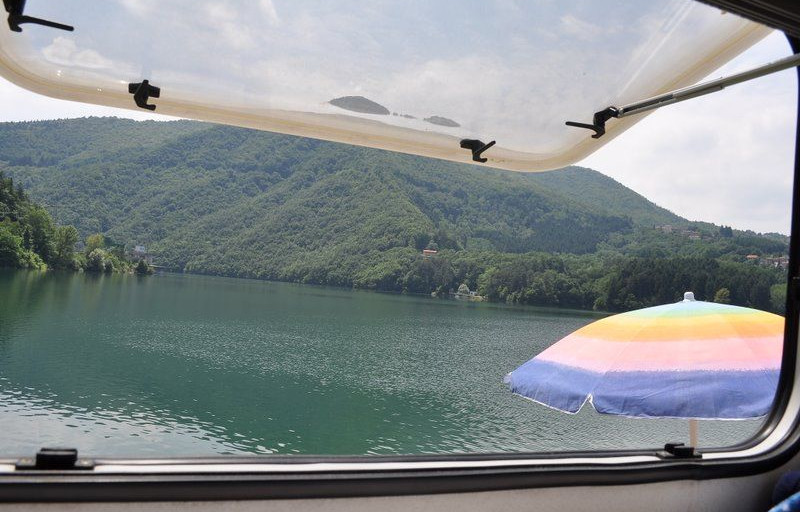 Presa la strada per Tolè, Vergato, si imbocca la Porretana passando da Porretta Terme. Abbiamo svoltato a Taviano Sambuca Pistoiese, Badi e poi costeggiato il Lago di Suviana fino ad arrivare al Ristorante la Spiaggetta dove , più giù, "all'Oasi di Lucy" (dove sembra di essere al mare per la possibilità di noleggiare i lettini e i pedalò), troviamo un grande e comodo parcheggio (gratuito nei giorni feriali e nei festivi 9 euro dal 1° giugno). Ci fermiamo per la notte e facciamo conoscenza con i vicini molto simpatici. Grigliatona, Vino e crescentine e si va a letto. Nottata tranquilla e freschissima. Al mattino, Daniele fa un giro in Mountain Bike, un percorso ad anello tirato giù da internet di circa 30km,passando anche dal Lago di Brasinome mentre io prendo il sole sulla riva del lago, leggo e faccio 4 chiacchiere con i vicini.