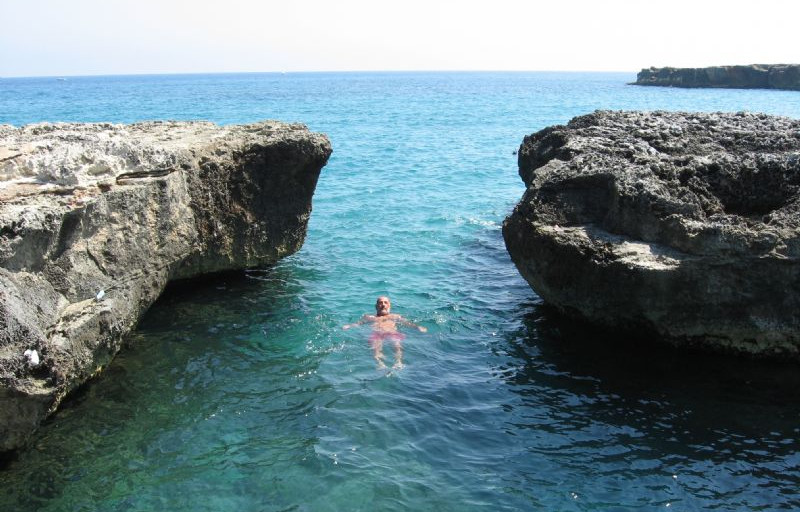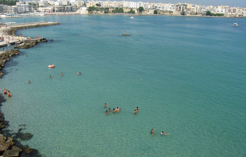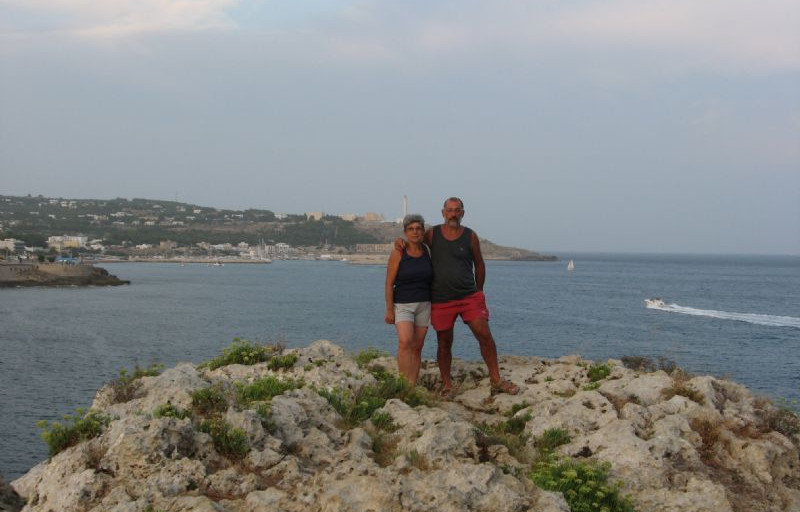 Mercoledì 26 agosto, siamo in ferie quindi con la dovuta calma, ripartiamo per Lecce.Parcheggiamo al Camper Park Fuori Le Mura, molto tranquillo con servizi.(15 euro).Gabriele, ci accompagna con il suo pulmino Fiat 850 del 1966 in città dove si festeggia S. Oronzo e anche qui le luminarie sono in tutte le vie, nella piazza c'è un enorme cupola di luci colorate ed è festa, festa in ogni angolo in ogni piazza.Ceniamo al ristorante "Il Latino" e poi anche noi passeggiamo in mezzo alla folla ascoltando musica. A fine serata ci ritroviamo in piazzetta battendo le mani a ritmo di una coinvolgente Taranta, suonata e ballata da giovani leccesi.Giovedì 27 agosto, continua la discesa, Arriviamo a Roca Vecchia litoranea S. Foca - Torre dell'Orso, parcheggiamo davanti al ristorante pizzeria Rokamel. Arrivati al mare ci rendiamo conto della meraviglia di questa costa che ha , tra le rocce, piscine naturali con acque cristalline dove noi passiamo l'intera giornata tra sole e bagni. A sera , considerato il numero di camper che si sono aggregati nel parcheggio, decidiamo di fermarci per la notte e andiamo a mangiare delle ottime cozze al ristorante del parcheggio.