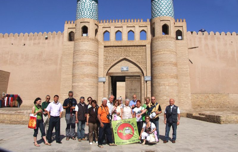 Sosta pranzo alle 15, durante il tragitto per evitare il passaggio di un ponte difficile, la guida sbaglia strada e ci troviamo improvvisamente alla frontiera con il Turkmenistan, torniamo indietro per una strada secondaria fortemente disastrata, arriviamo a Kiva alle 22 senza aver cenato, sono stati 200 km scansando buche, carretti, pedoni, mucche tutto al buio. Ci sistemiamo nel parcheggio dello splendido hotel Asia proprio sotto le mura.