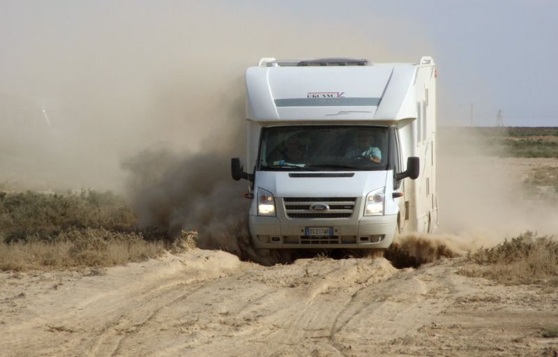 Ore 6 : piove, la dogana apre alle 8, usciamo alle 10 da quella kazaka, passiamo quella Uzbeka alle 15,30, i nostri accompagnatori sono fracidi per la pioggia, ci sono 17°, ore 18,30 abbiamo percorso 80 km di strada sterrata, e dopo 150 km dalla dogana troviamo la strada sbarrata da un posto di blocco che superiamo grazie all’assistenza della nostra guida Vittoria. Ci fermiamo nel deserto in un posto di ristoro in costruzione, in lontananza si vedono dei lampi enormi, tempo 10 minuti arriva violenta una tempesta di sabbia, che ci avvolge in un turbinio di polvere che entra anche nei camper, per fortuna che si trasforma in un temporale.
