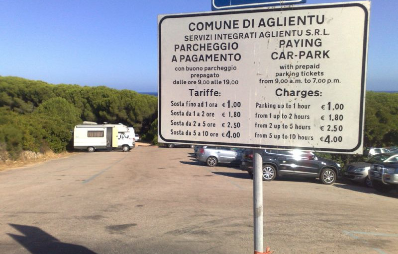 7° giorno Aglientu: proseguendo da Castelsardo verso S.teresa di gallura, sempre sulla litoranea, ho seguito le indicazioni che portavano presso il camping Marina delle rose, l'ho superato di circa 200 mt e sempre sulla sinistra ho trovato un parcheggio pubblico a pagamento (5 euro un giorno) dove per uno stradello arriviamo ad una spiaggia lunga e bellissima (LU LITARRONI). rimaniamo fino alle 18 poi, sul camper ritorniamo indietro di 200 mt al campeggio Marina delle rose dove c'è sosta camper service (carico, scarico e pernotto) a 21 euro.Parcheggio il camper in una terrazza stupenda fronte mare, col tramonto davanti. Trovo tanti camper e tutti in parcheggi bellissimi. La spiaggia volendo e' quella del giono prima, ma li tutta la zona, merita una passeggiata. Rimaniamo ancora una notte, visto che le tariffe vanno dalle 11 della mattina al giorno dopo stessa ora.