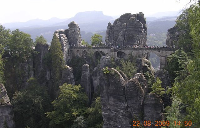 Preferiamo tornare in camper a Dresden senza utilizzare i mezzi pubblici, sosta nel parcheggio a pagamento e passeggiata tra gli innumerevoli monumenti storici un po’ anneriti dal tempo e dallo smog. Proseguiamo per il castello di Pillnitz, ampio parcheggio dove si potrebbe anche pernottare, ma quella sera c’è un concerto e perciò ci sarà molta ressa. Bellissimi e immensi i giardini, poco interessante gli interni. Ci spostiamo verso Bastei una delle zone più frequentate della Sassonia. Qui lo scenario è veramente spettacolare. Si cammina a piedi su e giù per scalinate e ponti per raggiungere gli innumerevoli speroni rocciosi che sovrastano il fiume Elbe.