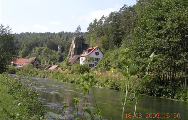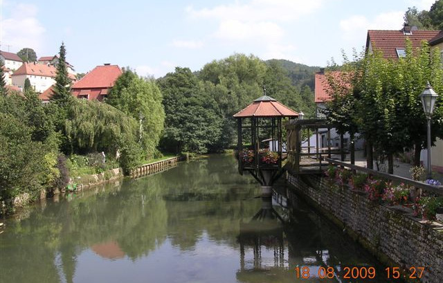 Sosta ad Hersbruch in parcheggio camper vicino alle terme 6 € a notte. Visita del grazioso paesino con numerosi edifici storici. Nel pomeriggio giro in bici per pista ciclabile lungo le gole del fiume Pegnitz, sino a Velden, picchi rocciosi accompagnano il percorso segnalato infatti con il simbolo di un picco roccioso.