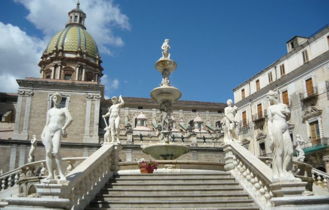 "Quattro Canti", o piazza Vigliena, o Ottagono del Sole, o Teatro del Sole, poi andiamo a vedere la Fontana Pretoria in "piazza della vergogna", poi entriamo nella Chiesa della Martorana e nella Chiesa di Santa Caterina tutte due in Piazza Bellini.