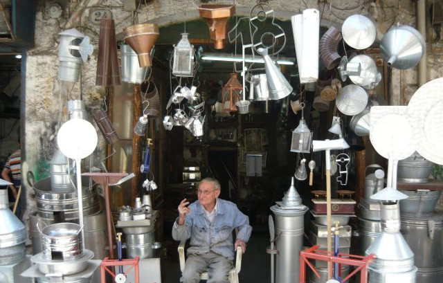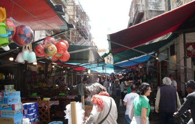 dedichiamo un'oretta ad una zona folcloristica: via Calderai piena di botteghe stracolme di tazze, lanterne, vasi da notte, pentole, caldaie, bilance, padelle, focolari ecc. ecc. tutti penzolanti sull'ingresso a nascondere, quasi del tutto, l'entrata della bottega, poi entriamo nel mercato più colorato della città: Ballarò dove ci attendono opportunità di acquisto irripetibili ... arriviamo in camper con le borse pienissime.