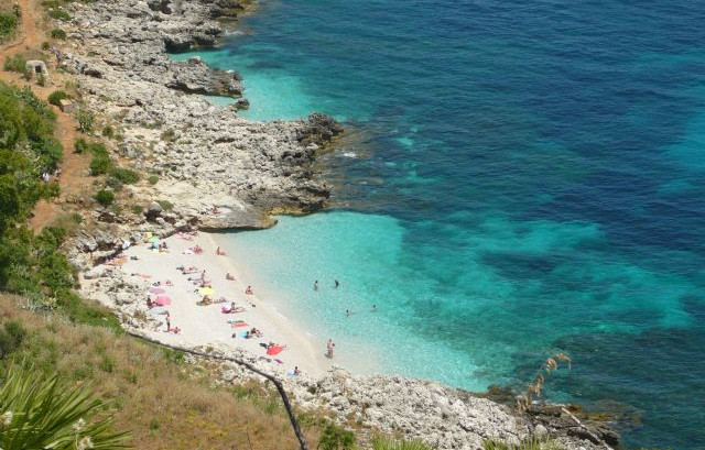 Oggi è Domenica anche per i Locali quindi per evitare la ressa in spiaggia ci spostiamo, sempre con il nostro fidato scooter fino a Baia Santa Margherita: litorale di costa e calette tra Castelluzzo e Macari che dal 01 Giugno, questa zona "famosa" per la possibilità di parcheggiare il V.R. a pochi metri dal mare in bassissima stagione, viene interdetta ai Camper e per raggiungere le calette ci si deve servire di un puntualissimo trenino gratuito che fa la spola tra le 2 località con cadenza di circa 15/20 minuti. Ottimo servizio, ottima idea per preservare questo Paradiso