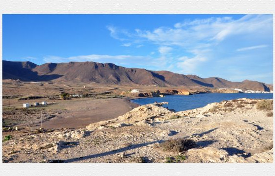 Proseguendo la stradina dopo il negozio si arriva a un posto panoramico. Guardando avanti lungo il mare si scorge in lontananza un complesso bianco sulla spiaggia. Quello è Los Escullos che visiteremo al ritorno.