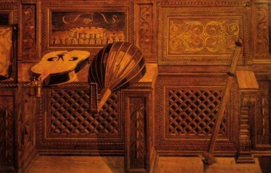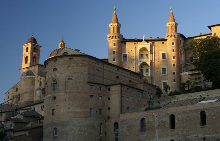 Andiamo in visita al Palazzo Ducale, dove trascorriamo tutta la mattinata e sul quale potrei scriverei delle pagine intere… in particolare sull’appartamento di Federico da Montefeltro, così elegante e ricco di simbologia. Fissare i soffitti delle eleganti sale per i ricevimenti, passeggiare nell’incantevole giardino pensile, camminare su di un raffinato pavimento a fiori, che bello! Il tutto illuminato dai colori oro e azzurro, una costante di questo luogo. La cosa che più mi colpisce del Palazzo è la magiadello studiolo ligneo di Federico, posta nella loggia tra i due torricini. Questa stanza è ricoperta da un preziosissimo mosaico in legno, realizzato probabilmente sui disegni del Botticelli e ricco di sfumature, realizzate grazie alla diversa stagionatura delle tessere! Gli oggetti raffigurati nei disegni raccontano la passione delprincipe per la scienza, l’arte, la letteratura, la musica. Che dire…di una bellezza mozzafiato. C’è anche molta iconografia bellica perché, non bisogna dimenticare che Federico era un guerriero, anche molto coraggioso. Tra l’altro sembra che sia ritratto sempre di profilo perché rimasto orbo in seguito ad un torneo.