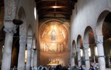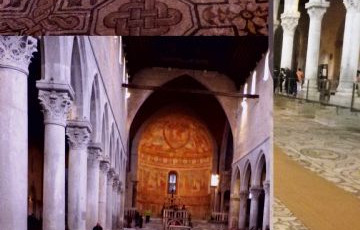 Bella al Basilica, vediamo anche la cripta e i sotterranei con altri pavimenti a mosaico, sotto le fondamenta del campanile (ingresso 3 Euro) . Saliamo anche sul campanile (2 euro) , per una scala a chiocciola stretta e coi gradini non proprio regolari, ma fattibili. In alto si vede il mare poco lontano e il paese sotto. Nulla di eccezionale. Pioviggina.