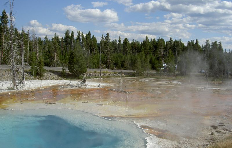 Al mattino ci dirigiamo verso l’ingresso del parco, ormai siamo nello stato del Wjoming e come entriamo troviamo un paesaggio desolato, tutta la foresta distrutta dal fuoco, un grande incendio successo molti anni fa ha distrutto completamente delle foreste, il sottobosco sta cominciando lentamente a ricrescere ma occorreranno ancora decine e decine di anni perché tutto ritorni come all’origine. Dopo un po’, però, cominciano a vedersi i luoghi per i quali va celebre questo parco, i geyser, le pozze di acqua cristallina, i colori del terreno nei pressi dei vari laghetti ed i bisonti che, forti della loro mole, si piazzano a centro strada bloccando il traffico dei turisti, che a debita distanza di sicurezza, li fotografano. Finalmente questi bestioni decidono di spostarsi ed il traffico può riprendere.