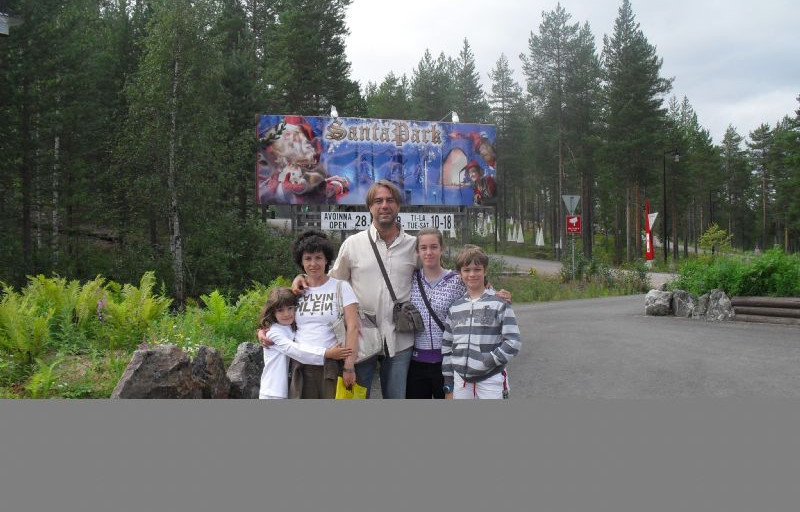 Ci alziamo vista mare ….che belloooo!!! Il cielo e’ coperto ma questo posto e’ affascinante anche cosi’. Ci avviamo verso Rovaniemi, quasi pare impossibile arrivarci con il camper, i bimbi sono impazienti ed anche noi e ci accompagna un sole splendente, fa caldo. Quando vediamo la scritta Rovaniemi all’entrata della citta’, mi fermo per una foto di rito col cartello non ci pare vero siamo qua! Girando per la citta’ vediamo l’albergo Rantasipi Phojanovi dove siamo stati a Novembre del 2007 e anche questo pare incredibile, lo ricordavamo immerso nel ghiaccio in un’atmosfera natalizia, ora era la’ con noi in mezzo al verde e gli batteva il sole addosso, passiamo proprio sul famoso ponte che vedevamo quando cenavamo. Dopo questo tuffo nel passato di non poche emozioni per noi, ce ne andiamo al Santa Park che non abbiamo visitato la scorsa volta.