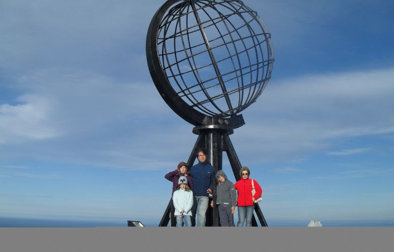 Imbocchiamo il famoso tunnel di 7 km precisamente 6870 mt per meta’ in discesa e meta’ in salita (70 euro andata e 70 euro ritorno), tanto che ho dovuto mettere la seconda per un momento, siamo all’isola di Mageroja e passiamo Honnisvag. Non ci fermiamo vogliamo arrivare!! Si sale, praticamente tutte curve e colline poi il deserto e mare. Poi ad un tratto scorgiamo da lontano in salita un gabbiotto, con la scritta Nordkapp, (scendiamo e facciamo la foto anche con lui), ci avviciniamo vogliono 80 euro per 2 notti senza acqua pozzetto ed altro ma c’era lui………..il Mappamondo simbolo del punto piu’ settentrionale d’Europa. Parcheggiamo il mezzo e col sole pieno notiamo il piazzale pieno di camper e una gran soddisfazione di essere arrivati li, con tutti i miei figli. Avevo promesso a me stesso che ce l’avrei fatta. Veder Daniela dopo quello che ha passato ridente saltellare di gioia e i miei tre gioielli contenti per aver raggiunto quel posto, e’stato per me una delle piu’ grandi soddisfazioni . Insomma, li non c’era un gran che, era finita la strada e quindi ci siamo goduto questa giornata. Ma chi ti incontriamo? E si ancora loro gli olandesiii!!!